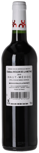 Château Moulin de la Mothe Haut-Médoc er i topårgangen 2019 fremstillet på et blend af 85 % Merlot og 15 % Cabernet Sauvignon, som selekteres fra et dobbelt bæredygtigt certificeret mikroterroir på 7,45 hektar. Perfekt beliggende i hjertet af toplandsbyen Saint-Seurin-de-Cadourne – nærmest direkte op ad grænsen til Saint-Estèphe! Traditionel vinificering med 3 ugers macerationstid, hvor drueskindet føjer seriøs farve, karakter og tanniner vinen.